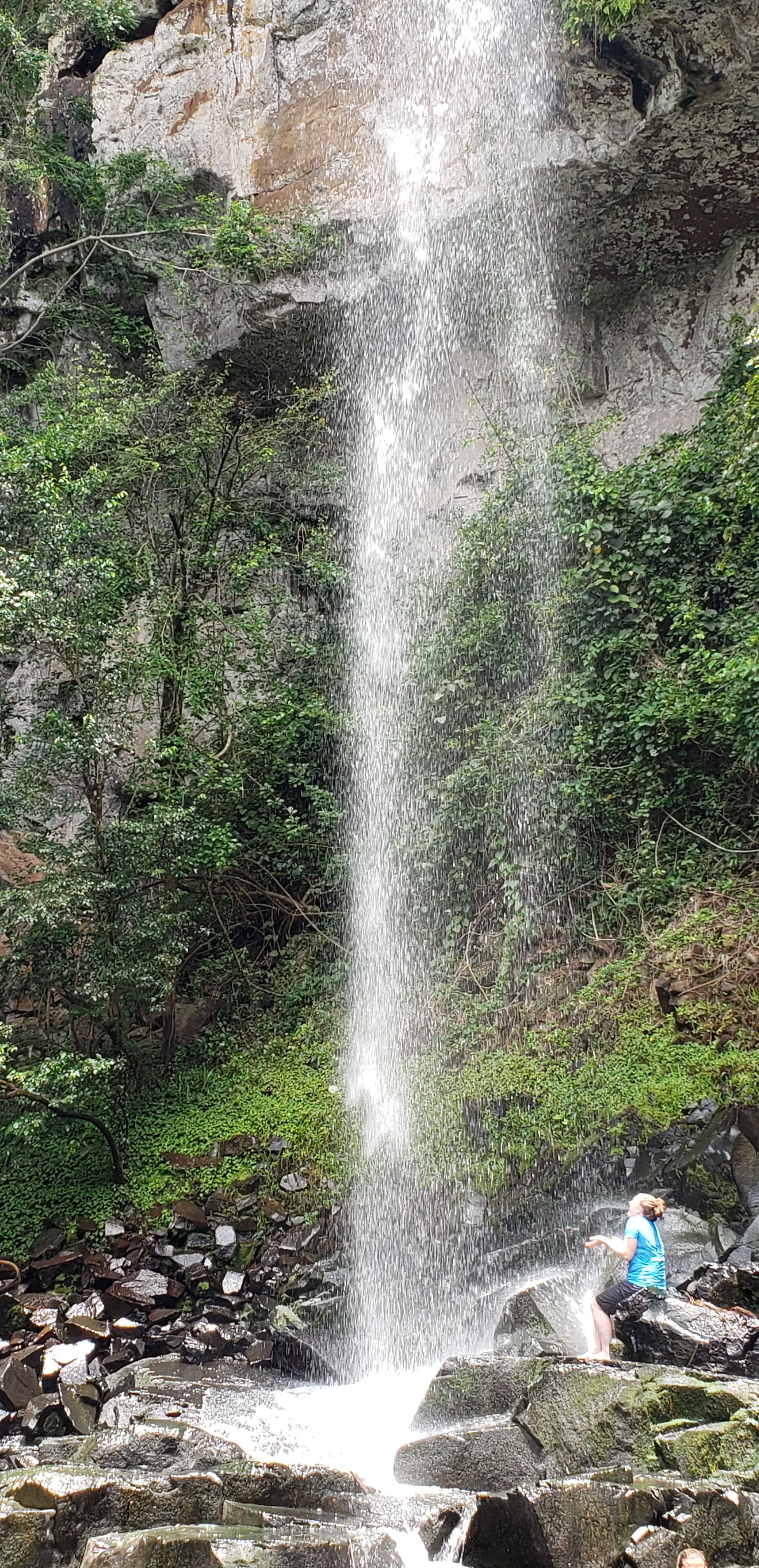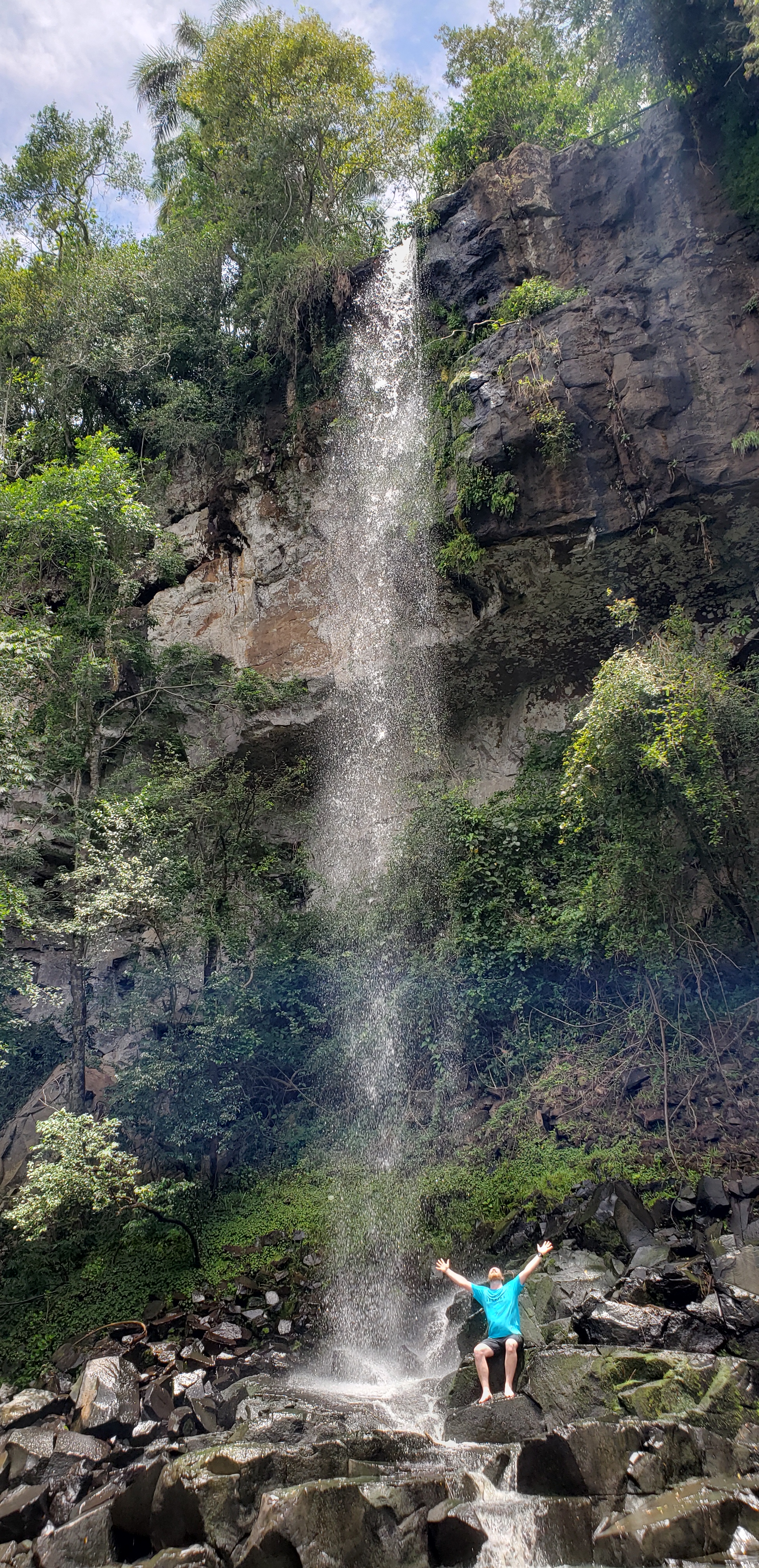The last kilometer was filled with steep stairs, tiny passageways through boulders that only one person at a time could fit through, and then you are rewarded by an incredibly tall waterfall with a wading pool at the bottom. It sparkled in the sunlight with rainbows everywhere. And of course…we both had to climb up the rocks and stand underneath it. Salto Arrechea, folks!