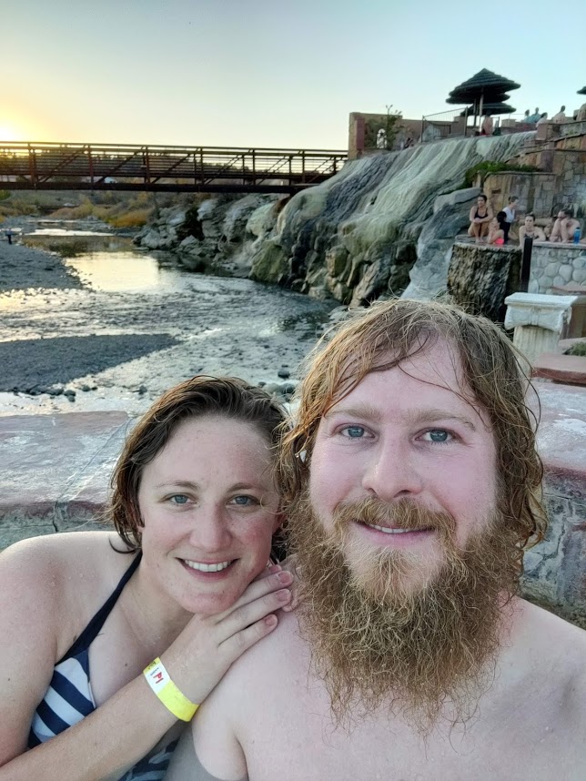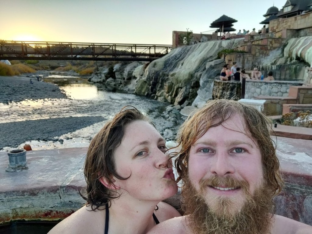 The mineral formations that have been created over time from the calcification of the hard water are really beautiful and totally unique! You can see some of them in the background of our pictures below. We relaxed and enjoyed all day and all evening until they kicked us out at closing time, 9:30 pm. These would be clutch after skiing all day.