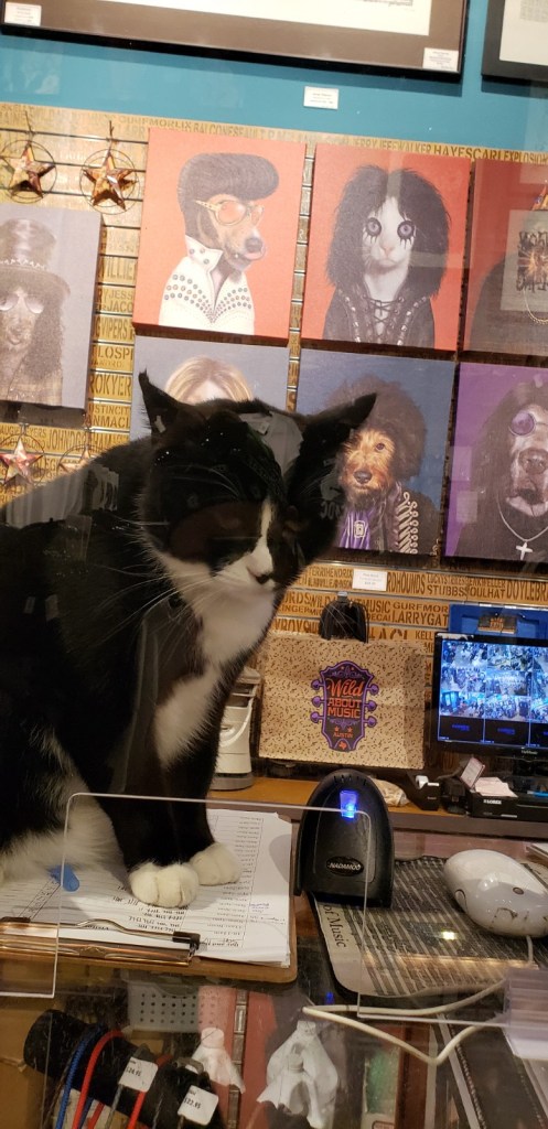 We walked all the way to the Congress Ave and tried to take some Lime scooters up to the state capitol, but the capitol grounds were closed off to the public so we could only sightsee from the street. Ah, well…found a rockin’ music store and gift shop on Congress and spent some time shopping around and playing with the shop’s resident tuxedo cat, Louis.