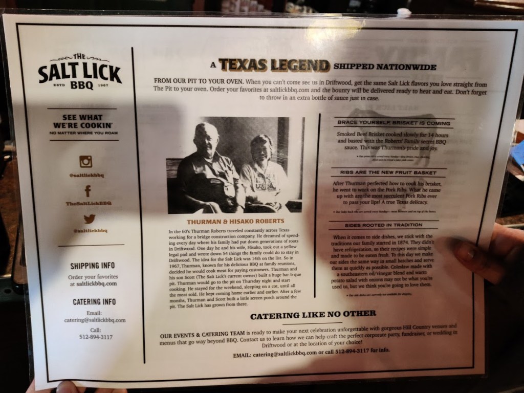 Ended our 8 mile hike day epically….Salt Lick BBQ!! The first of 2 legendary Texas BBQ joints we dined at while in Austin, both of which were so delicious, so perfectly cooked, and uniquely different from any BBQ we’d ever had. People reading this who like BBQ – if you haven’t had Texas BBQ, you’ve been MISSING OUT! Famous Daves and Dickey’s don’t even hold a candle. Period.